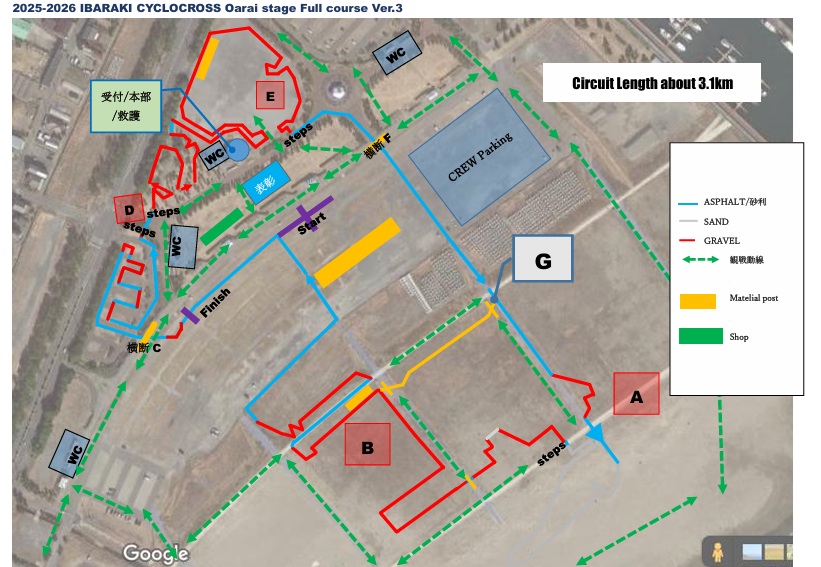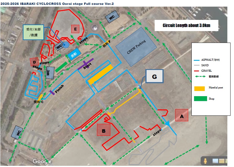階段(steps)やシケイン(barriers)もありませんので、小さなお子様もシクロクロスらしい芝、砂利、アスファルトといった路面変化を楽しんでいただけることと思います。